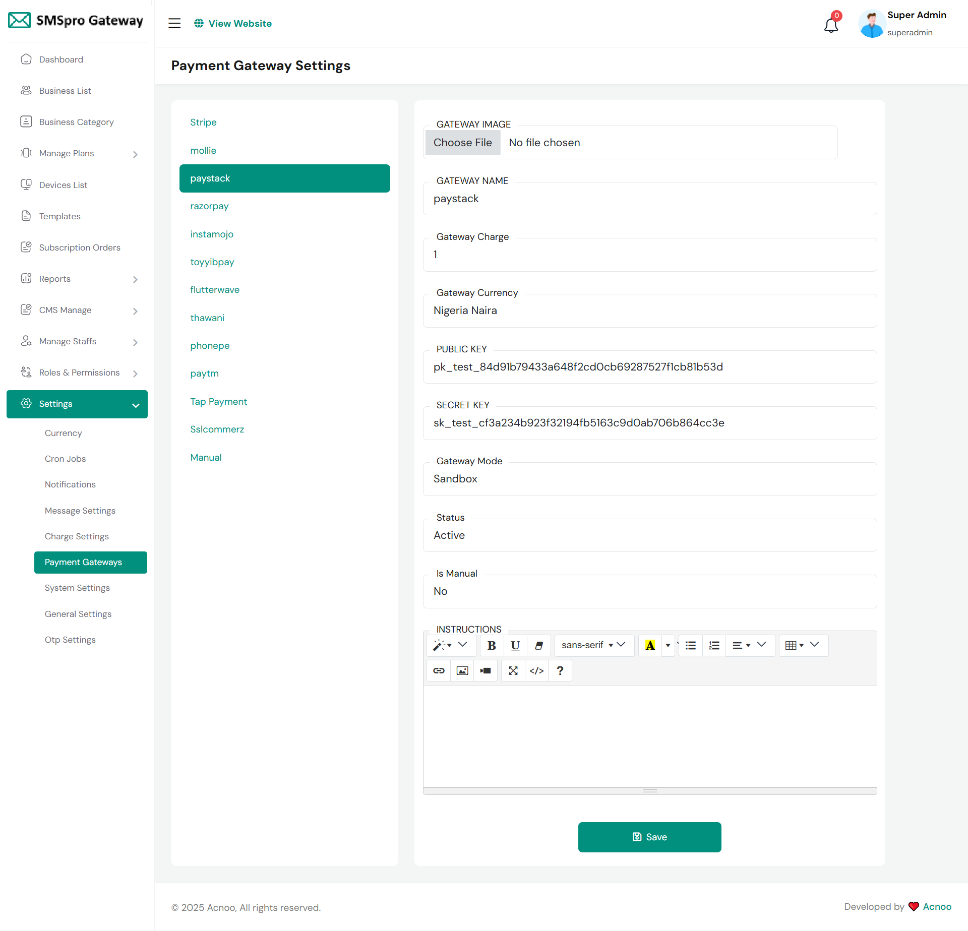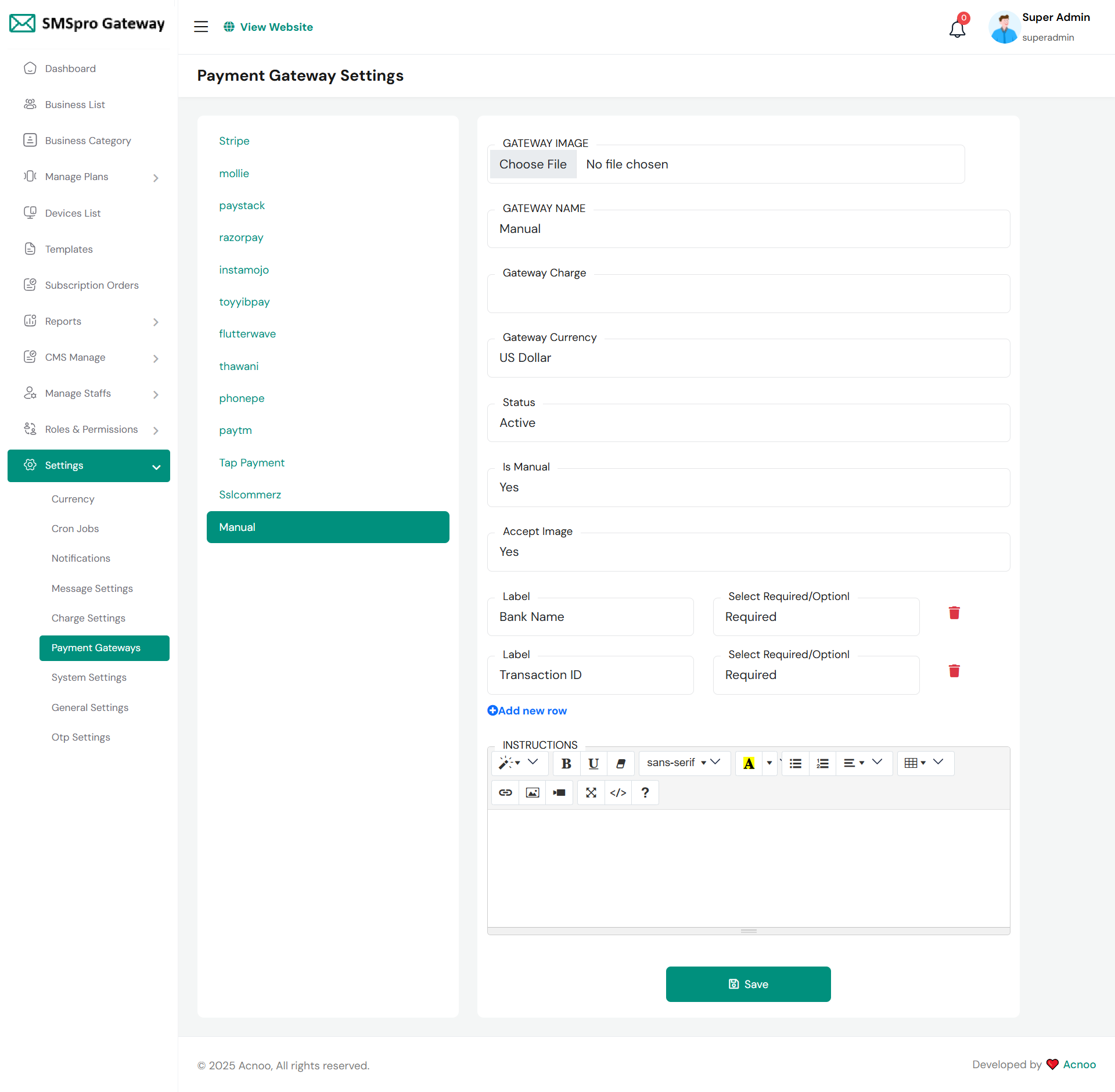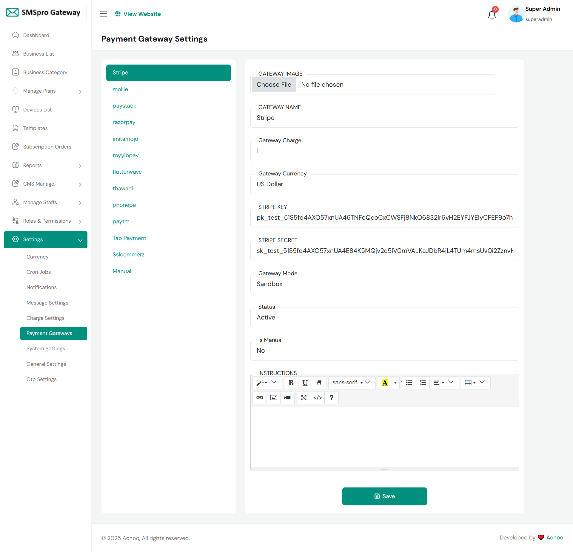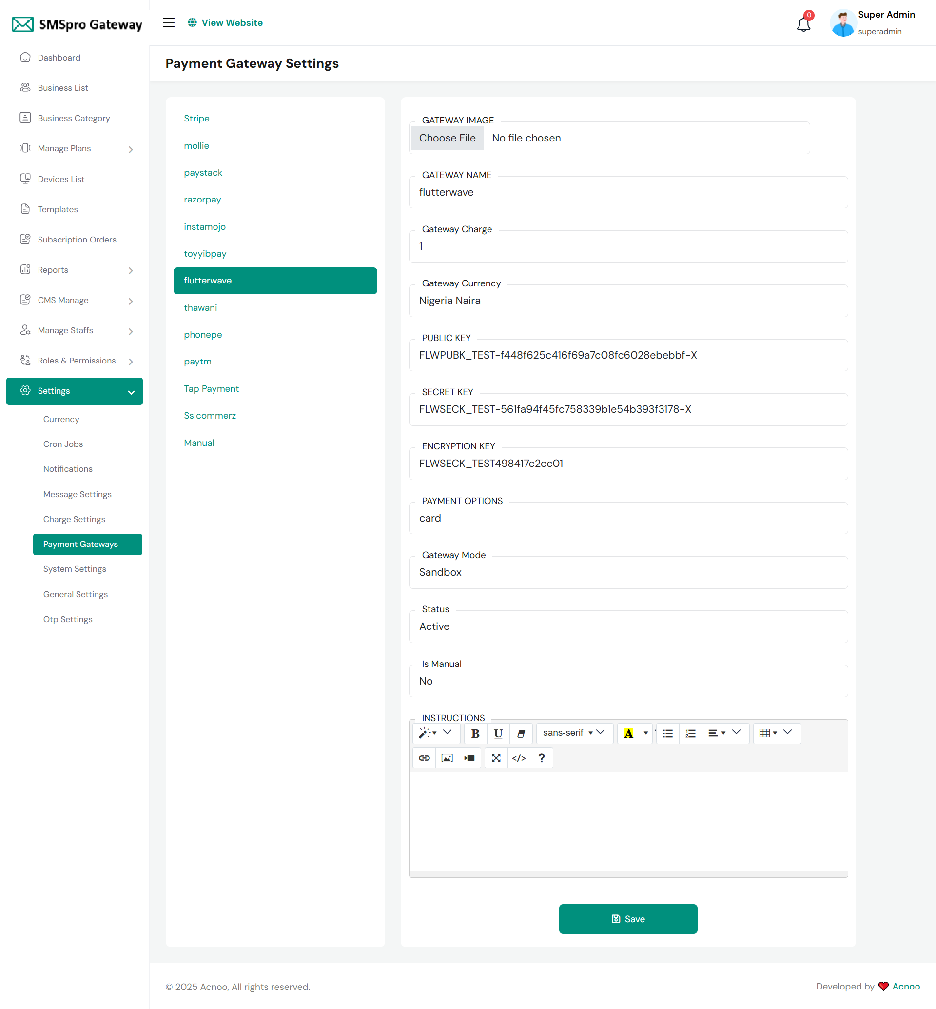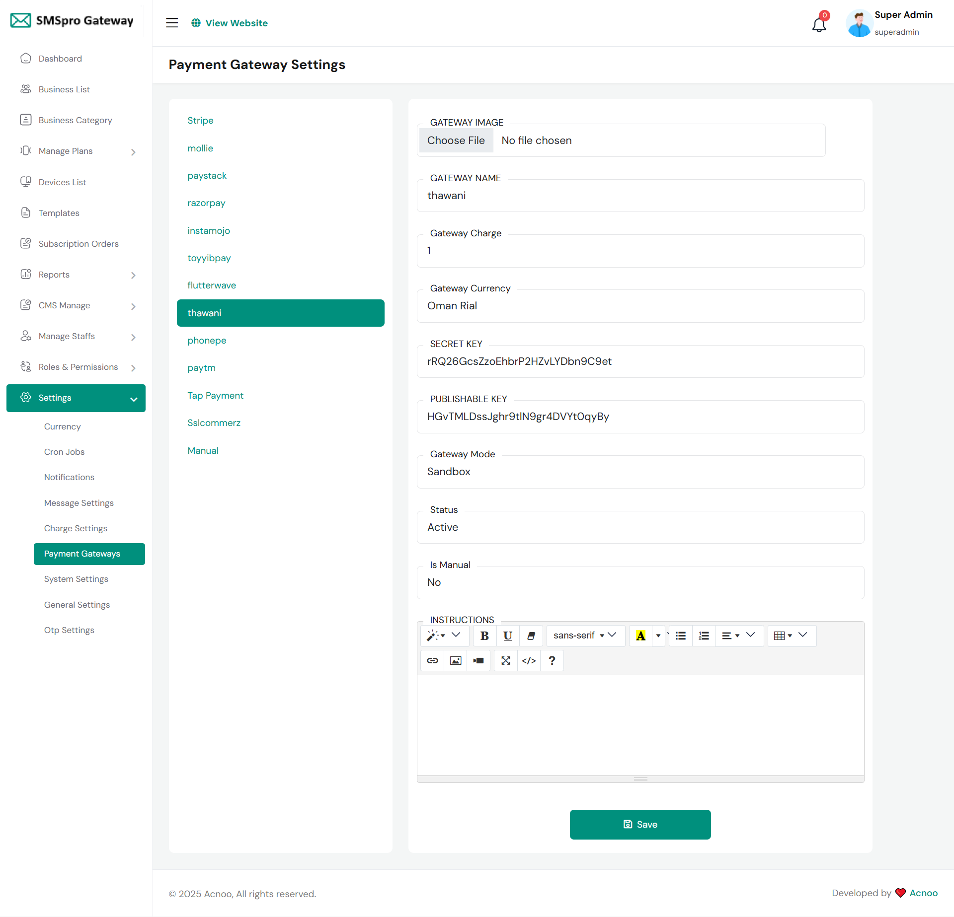 In this section, you can send messages using an SMSpro Gateway. From Gateway Settings, you can change the SMSpro Gateway. The process differs depending on the type of gateway selected. Below, we discuss the two available scenarios: