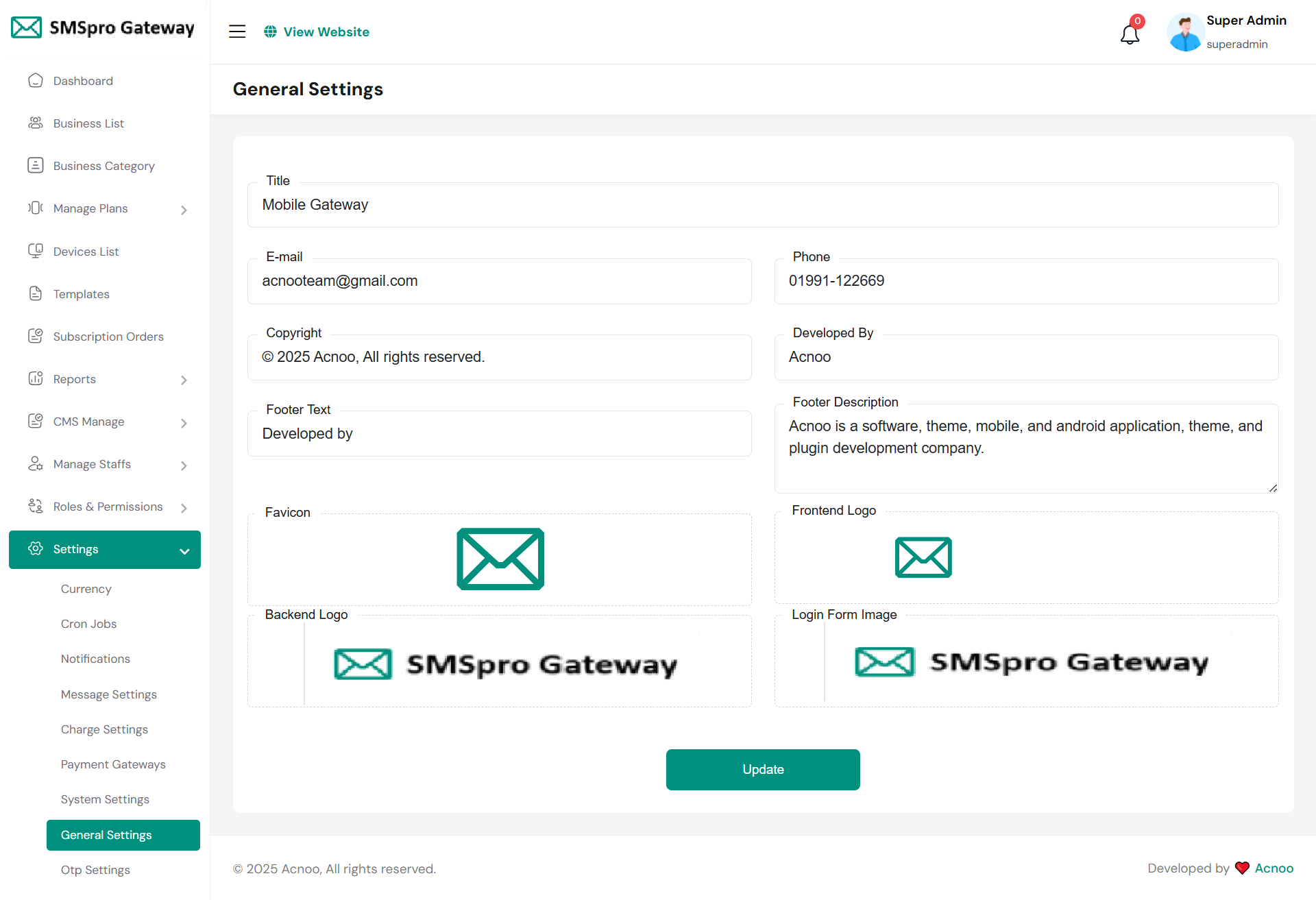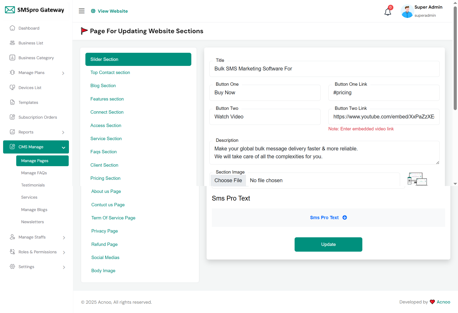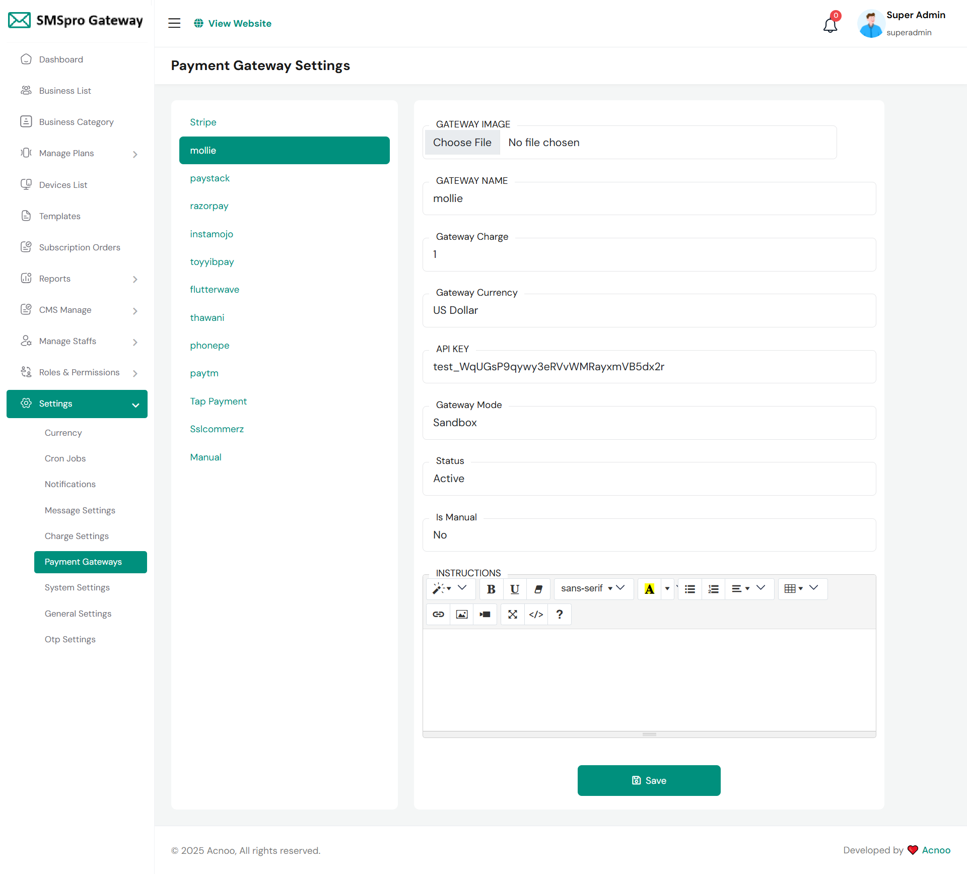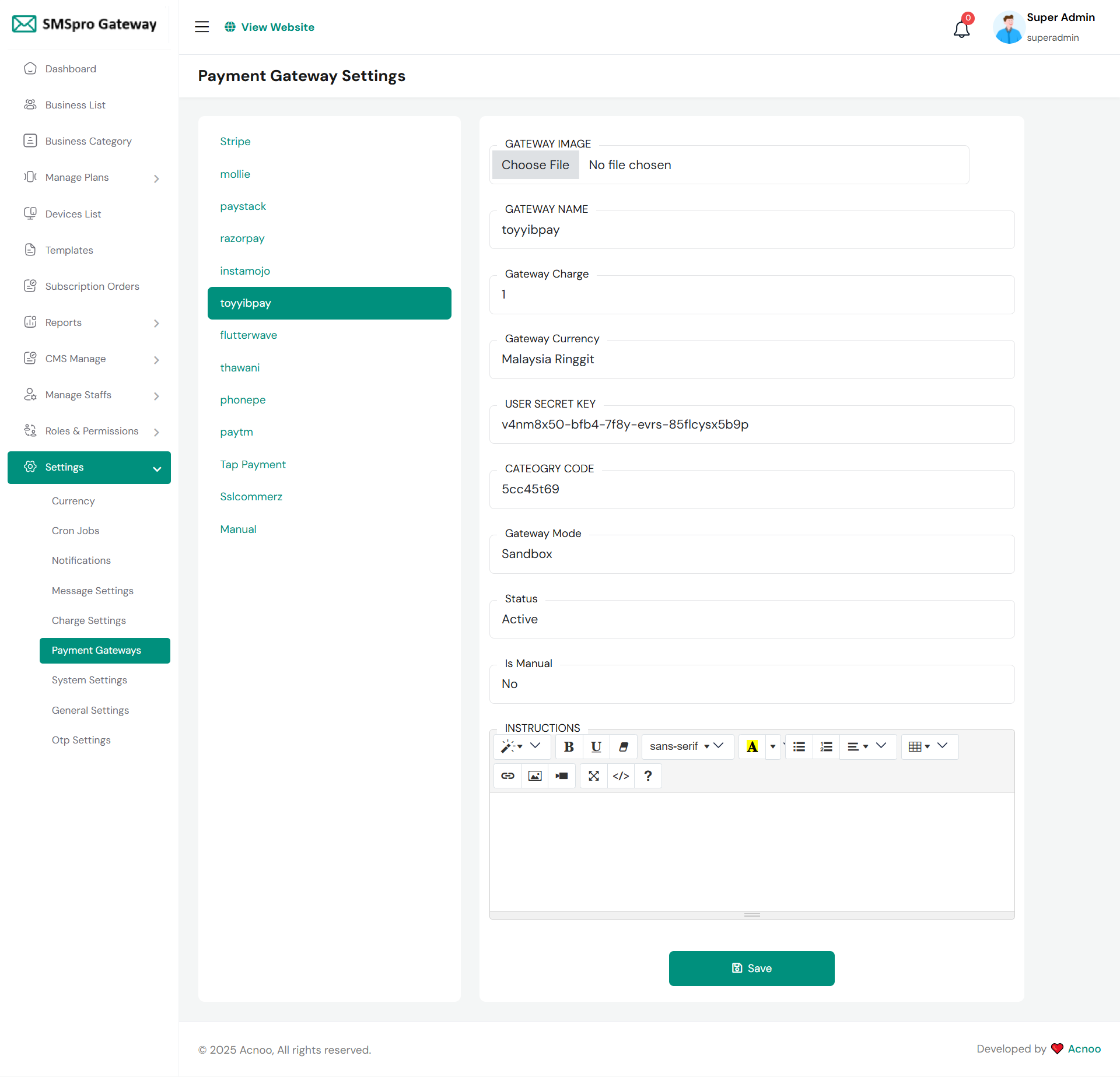 In this section, you can send messages using an SMSpro Gateway. From Gateway Settings, you can change the SMSpro Gateway. The process differs depending on the type of gateway selected. Below, we discuss the two available scenarios: