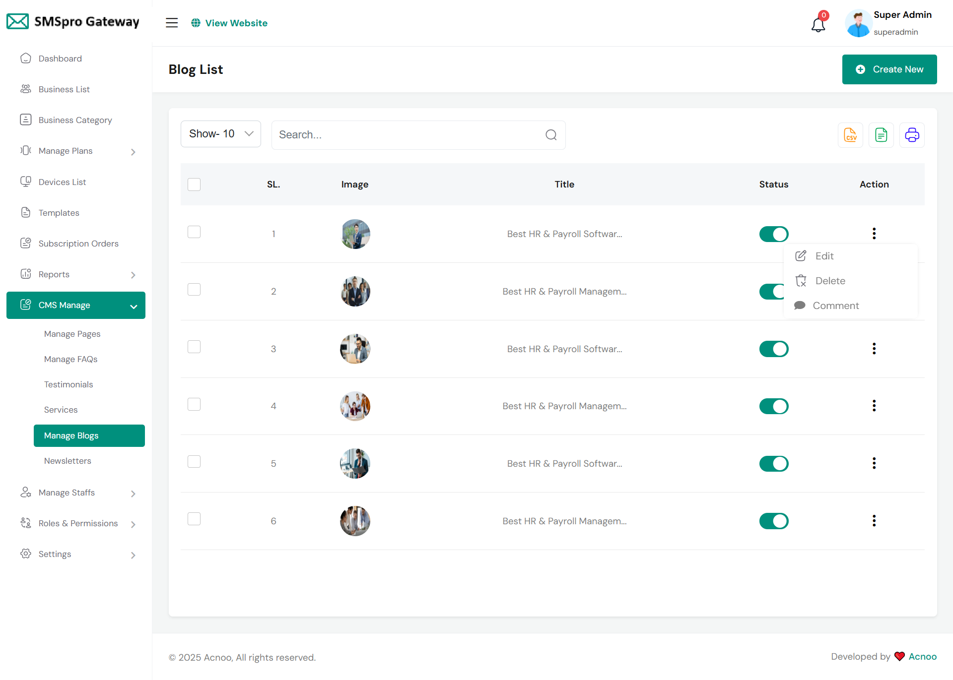 Here, you can view the gateway list, update user details, and use available search filters and export options.