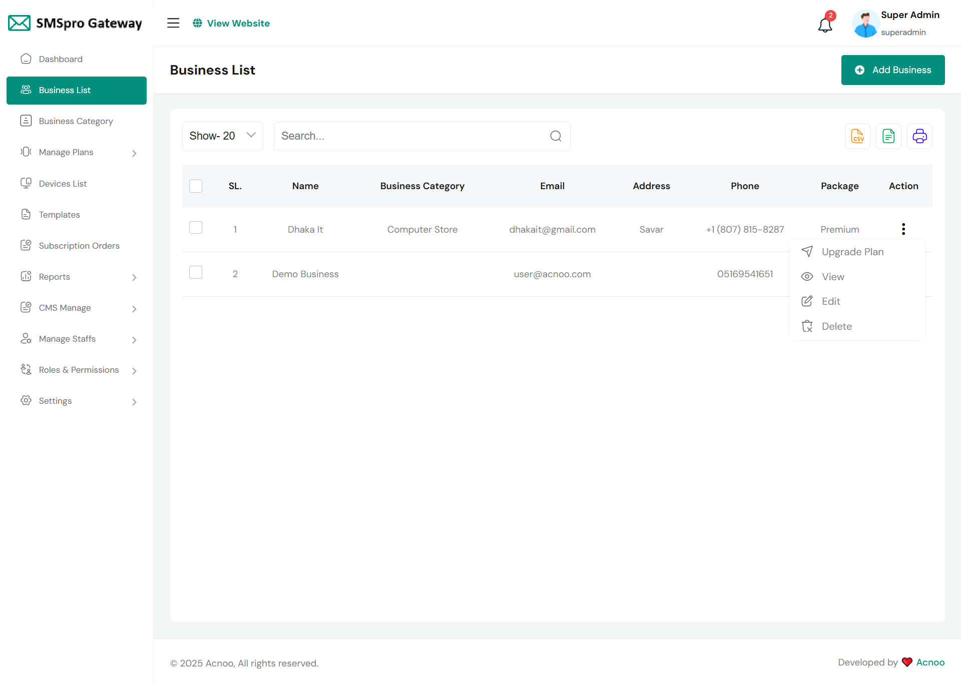 This appears to be a screenshot of a business list page. Business list functionalities typically allow users to collect and organize information about businesses. By clicking the "View" button, you can see the details of each business. You can also create a new business by clicking the "Add Business" button. Below, we'll describe how you can create a new business.