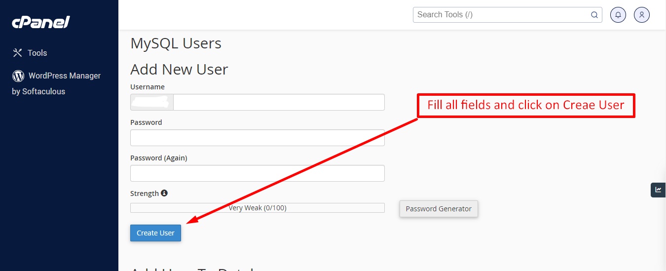 Here, you can create a user by filling out the required fields. Remember to use a strong password and store it securely.