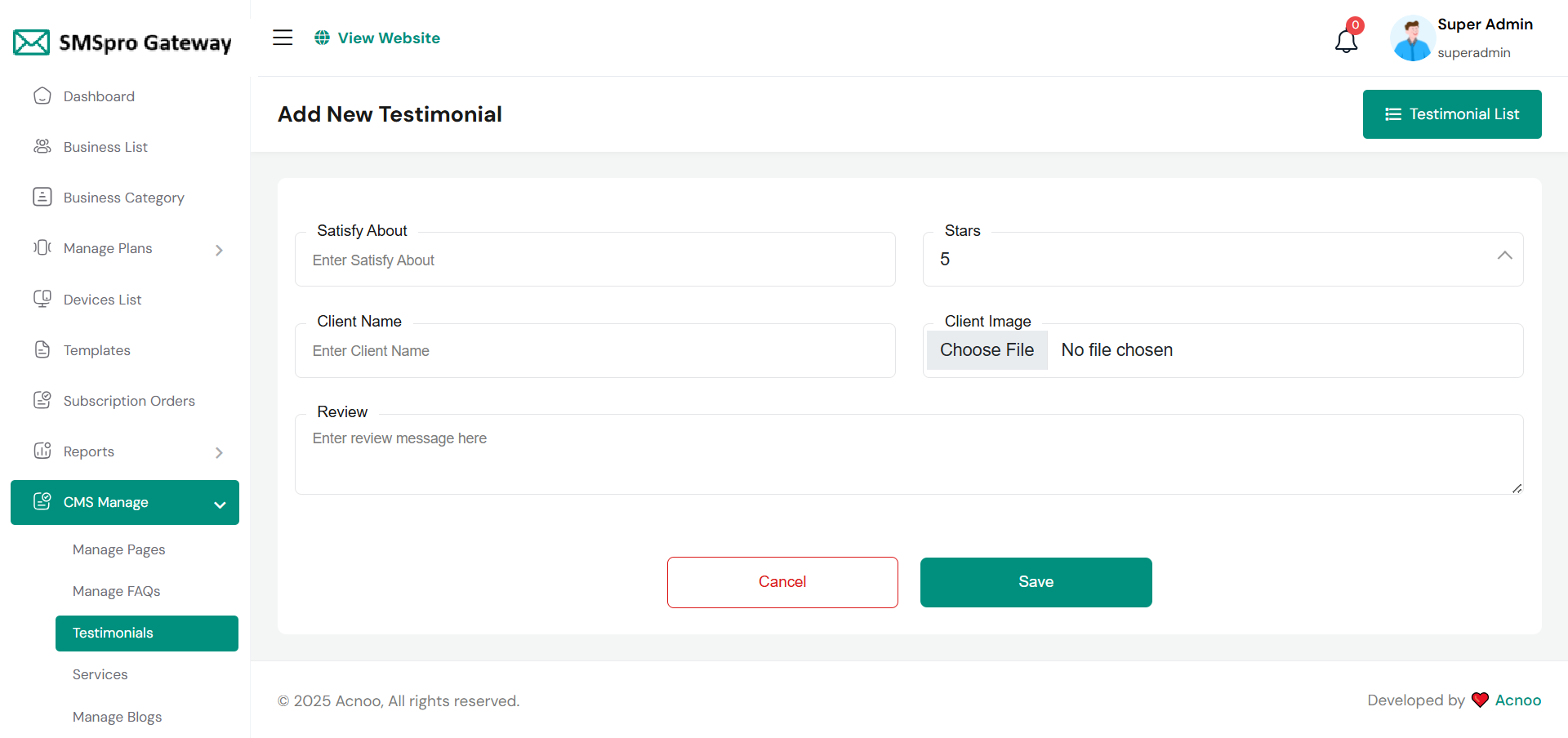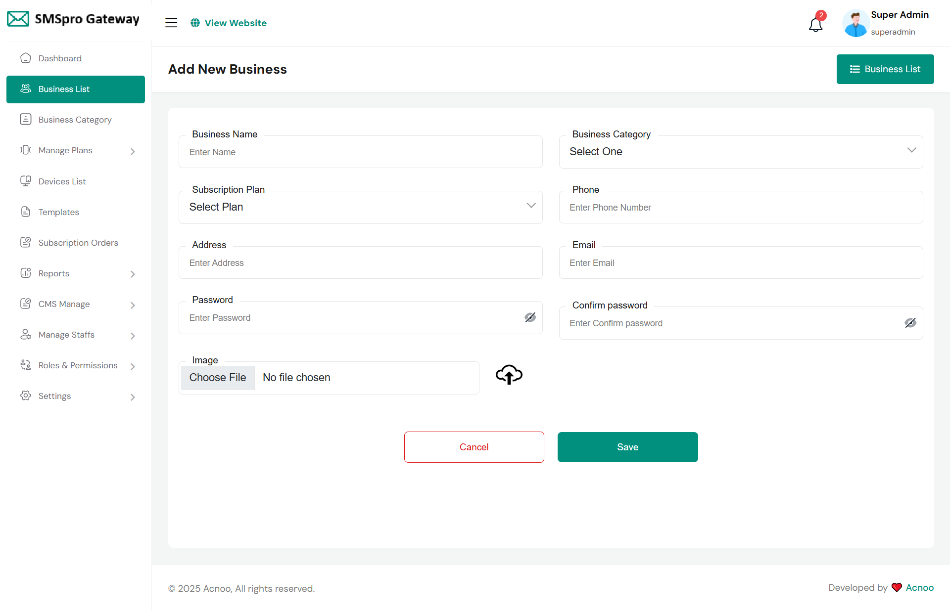 By clicking on the "Add Business" button, you can create a new business. You will need to fill in the necessary fields. Here is the screenshot of the create business page.