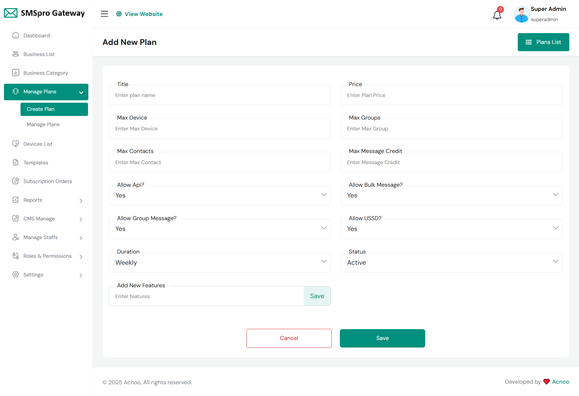 Here, you have the option to create a plan according to your preferences. Additionally, you can add multiple features by using the "Add New Feature" input field. Once you have completed filling out the form, simply click the save button. You can also review the activity of your entries. If you decide not to proceed with creating a plan, you can click on the cancel button.