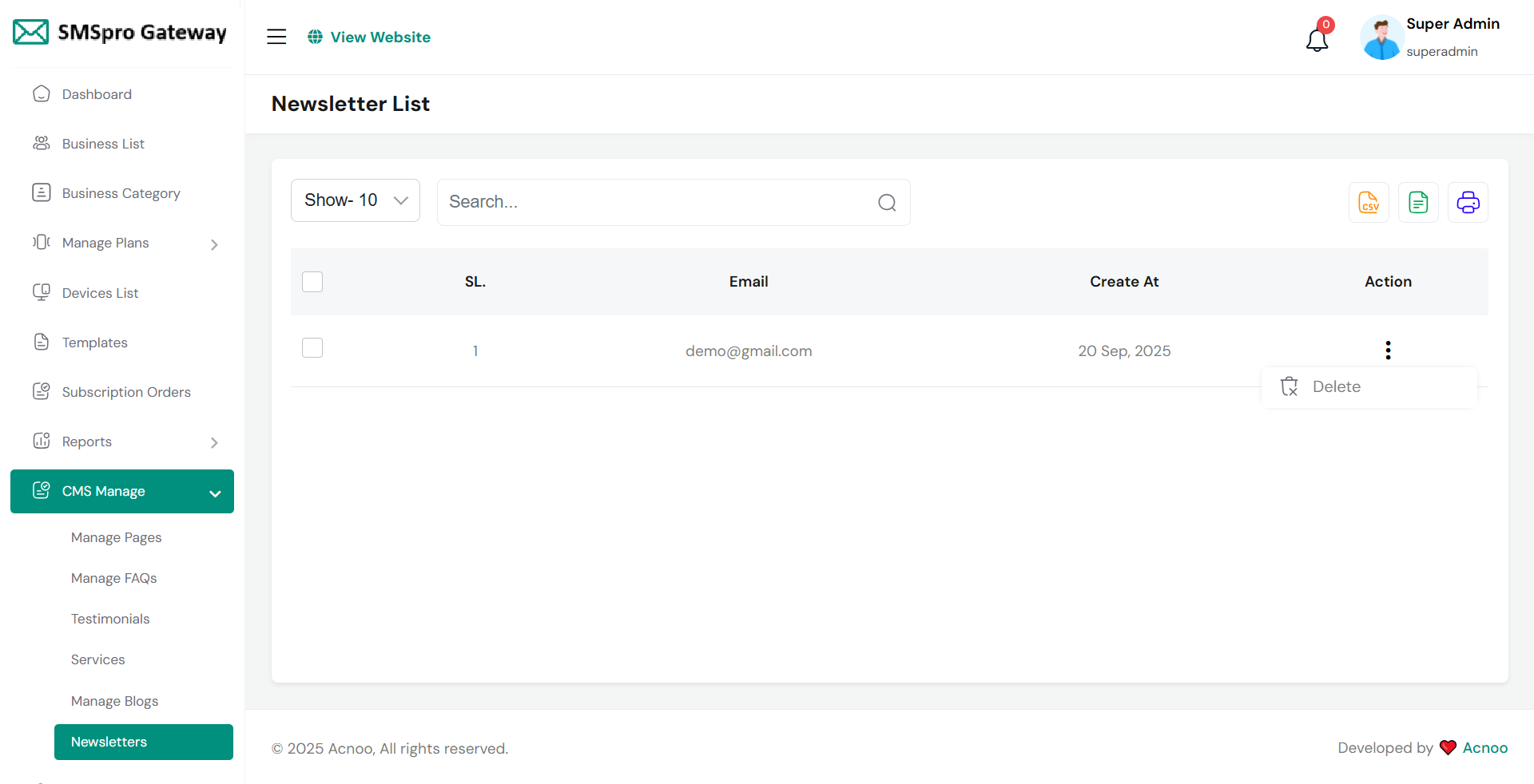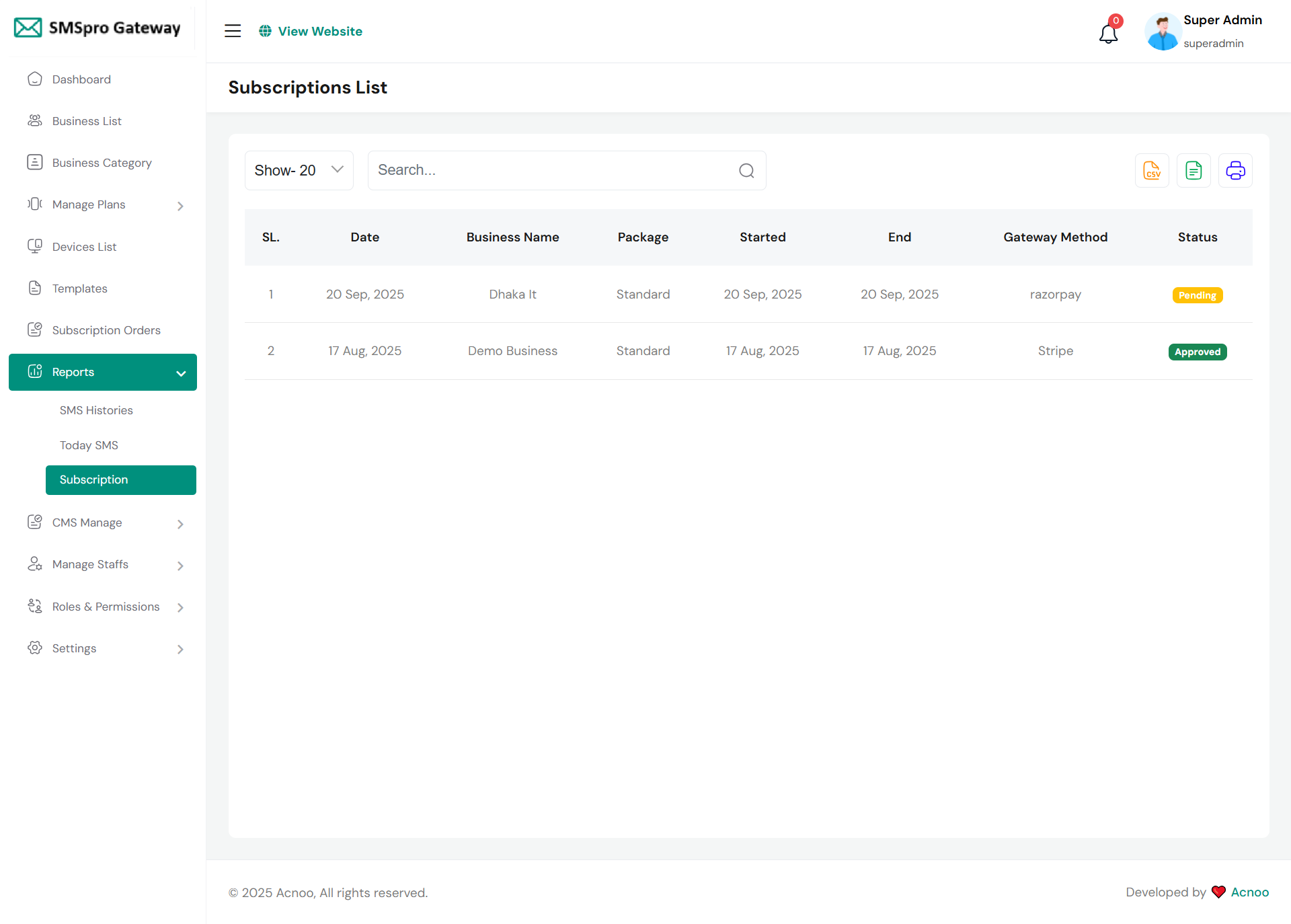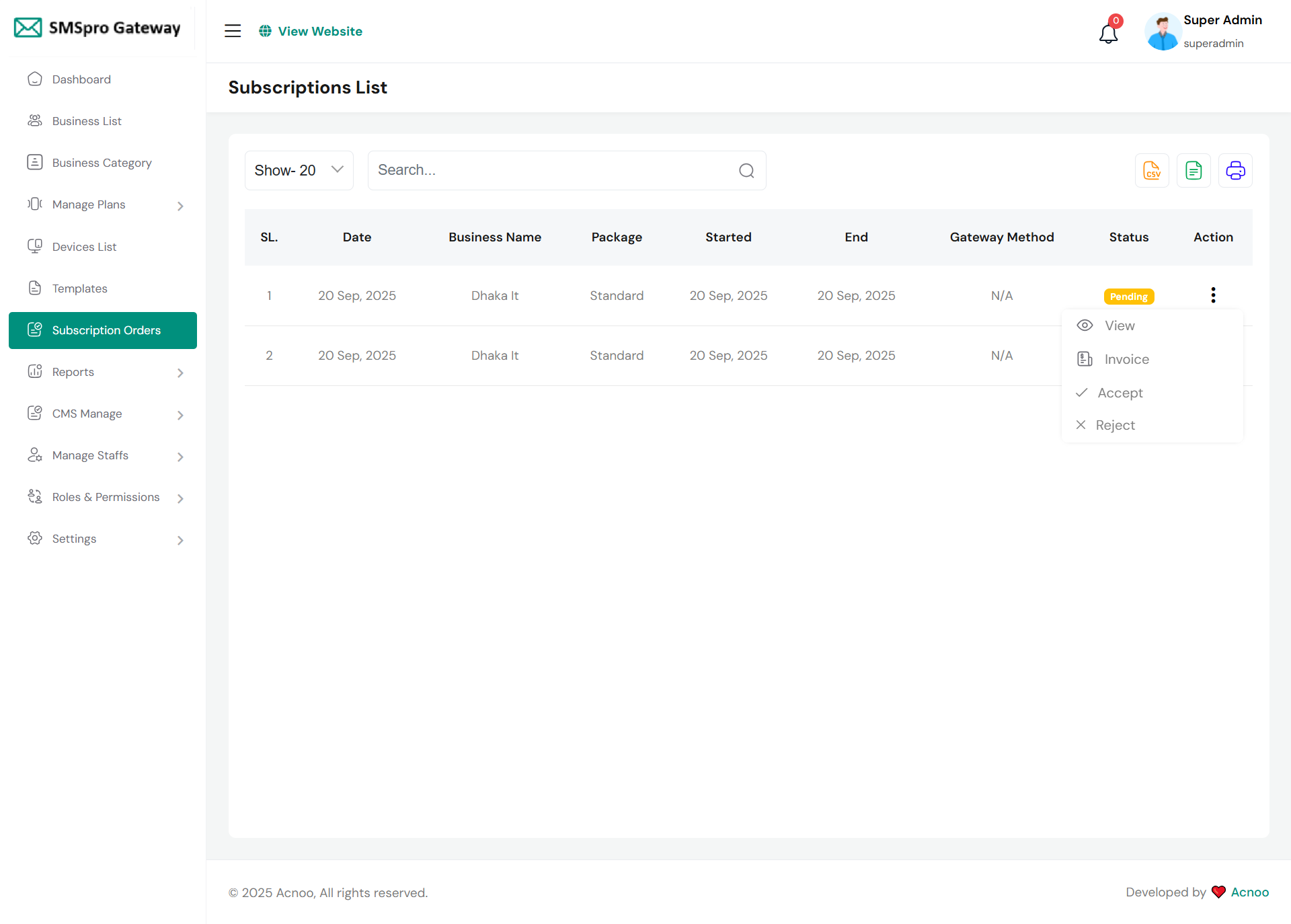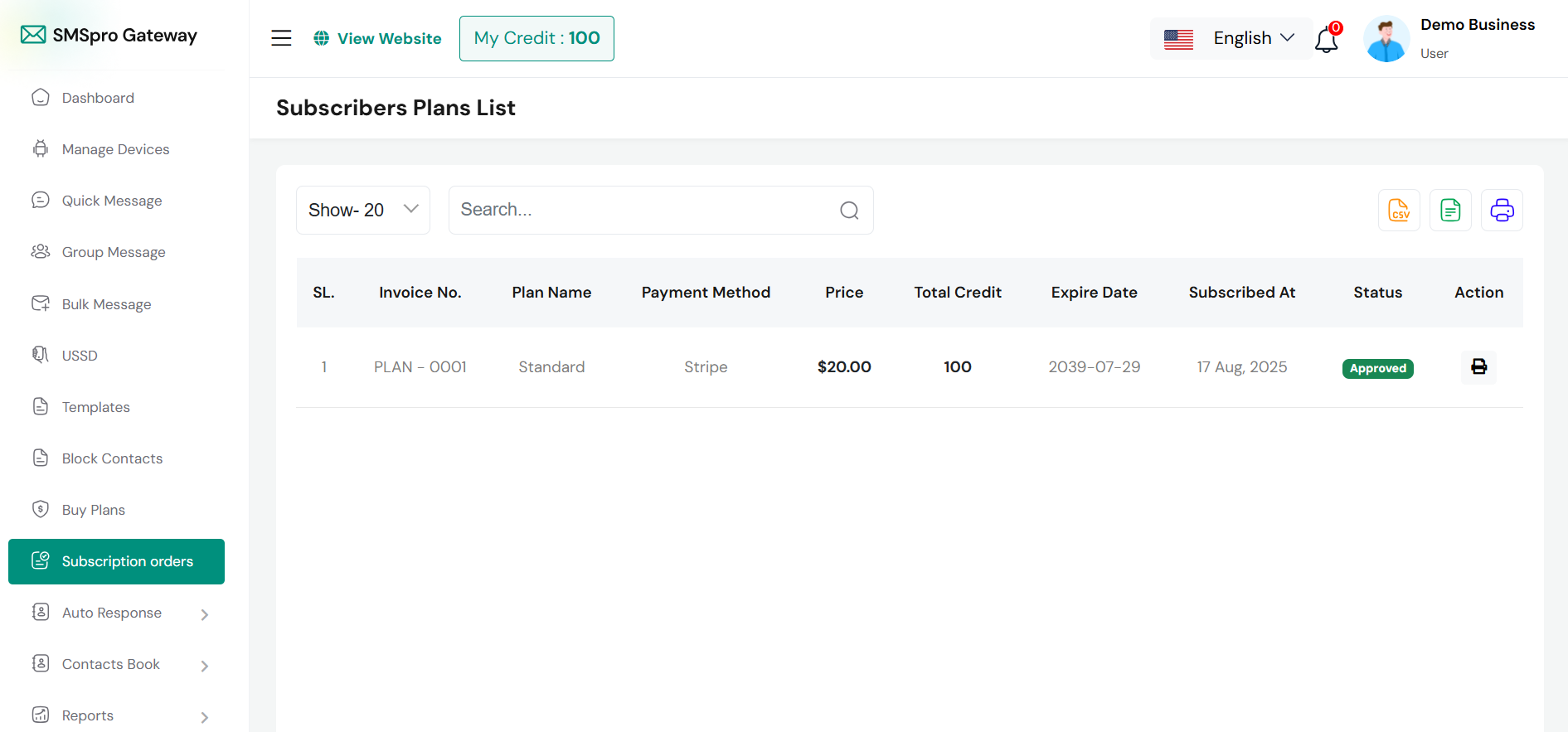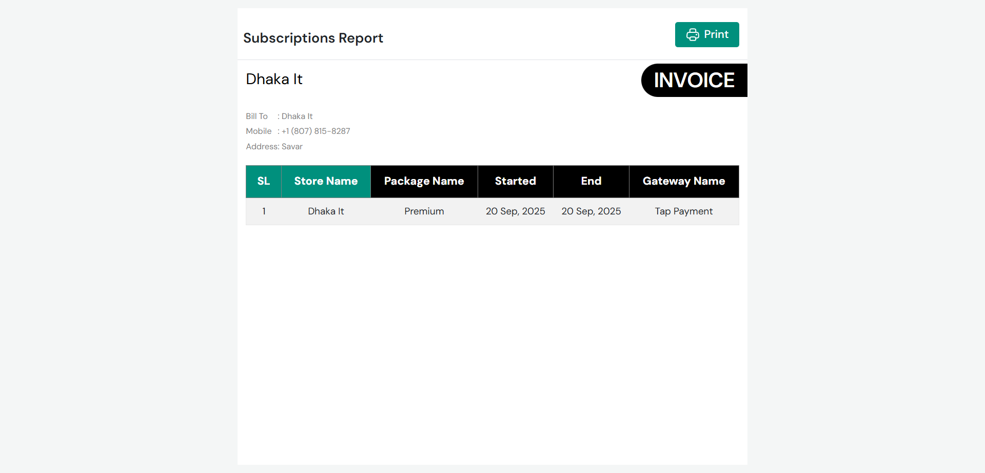 Here, you can view your subscribed orders, search through the list, and export data. Additionally, you have the option to generate and print invoices