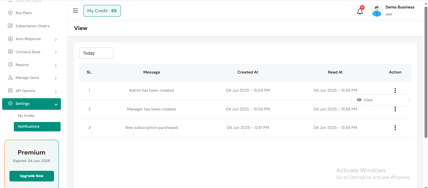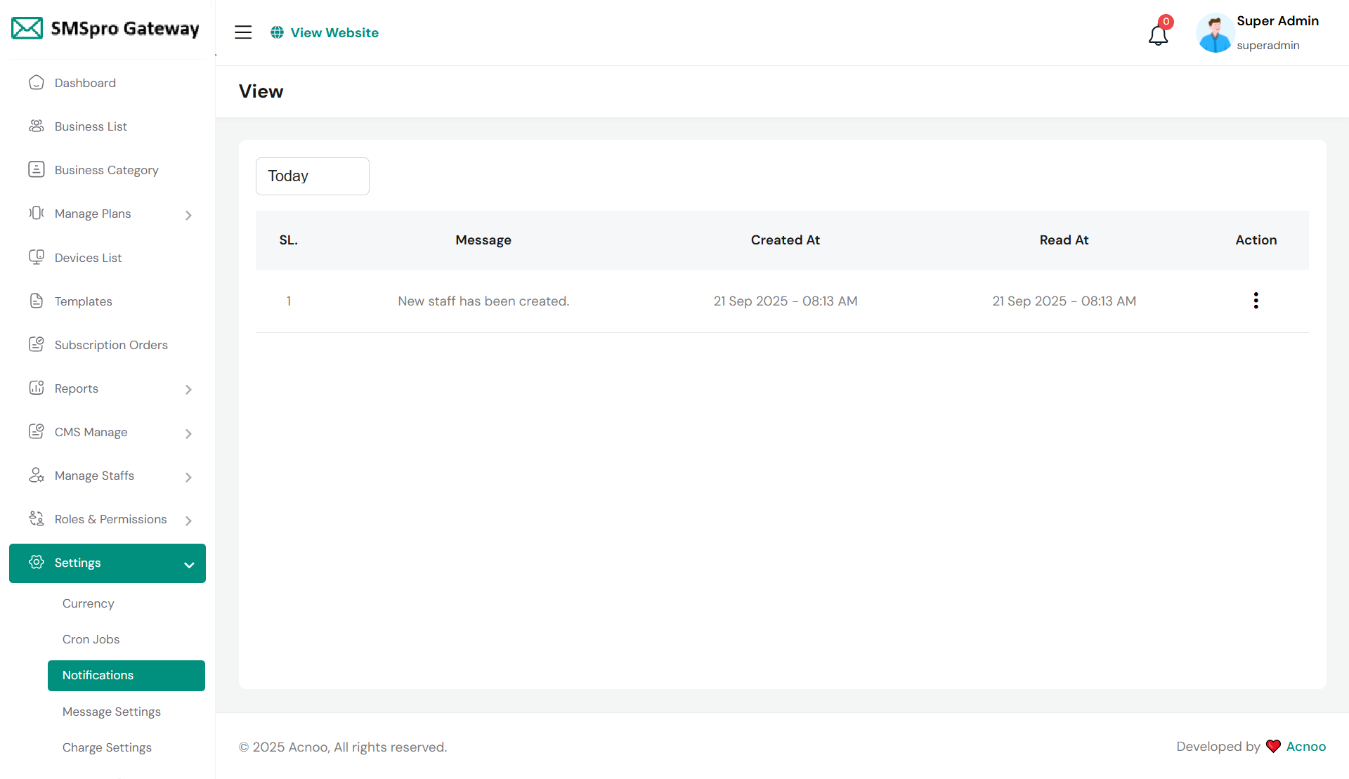 Here, you can view a list of various notifications. You also have the option to filter these notifications based on available criteria.In each list, clicking the "View" button allows you to see detailed information.