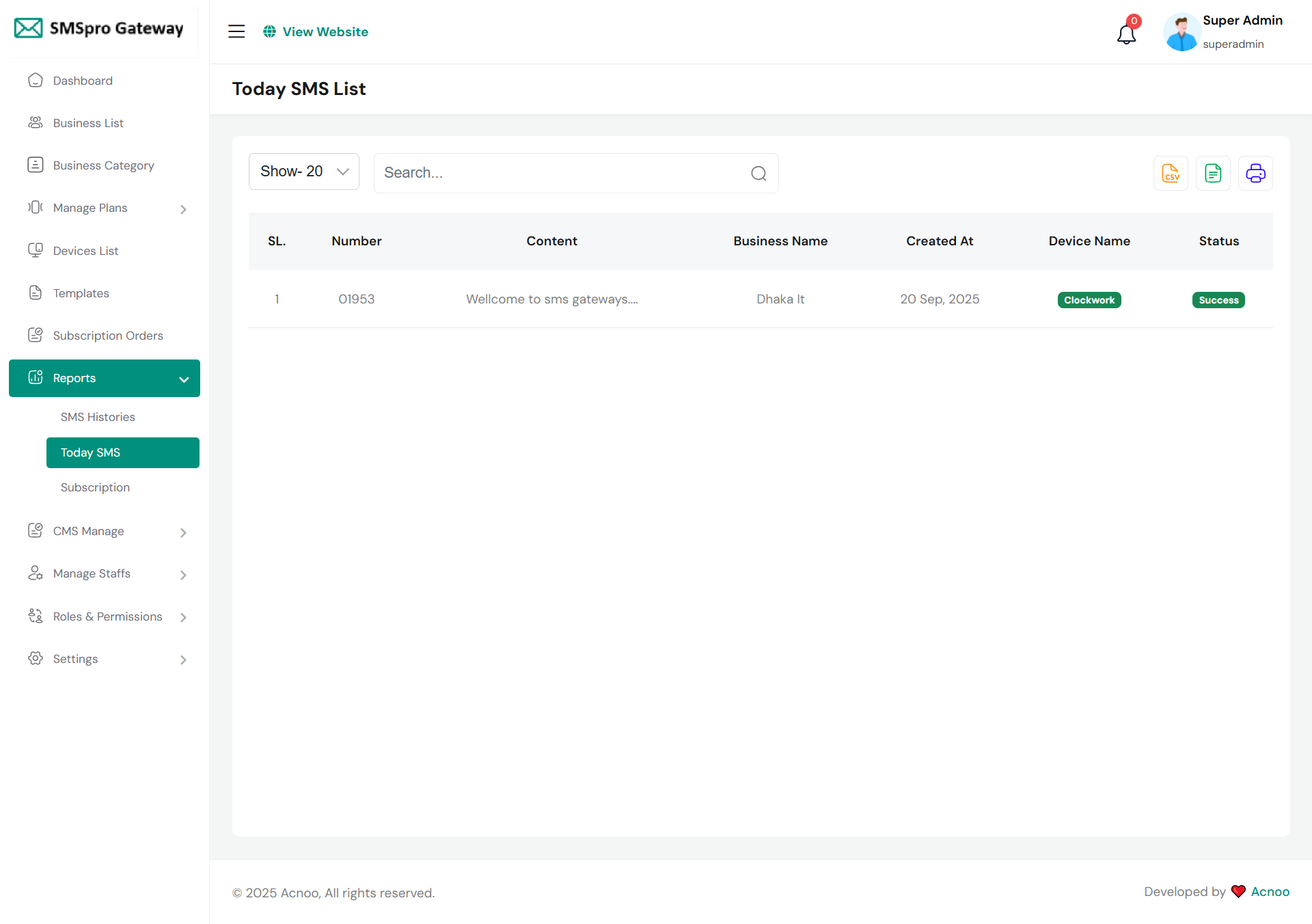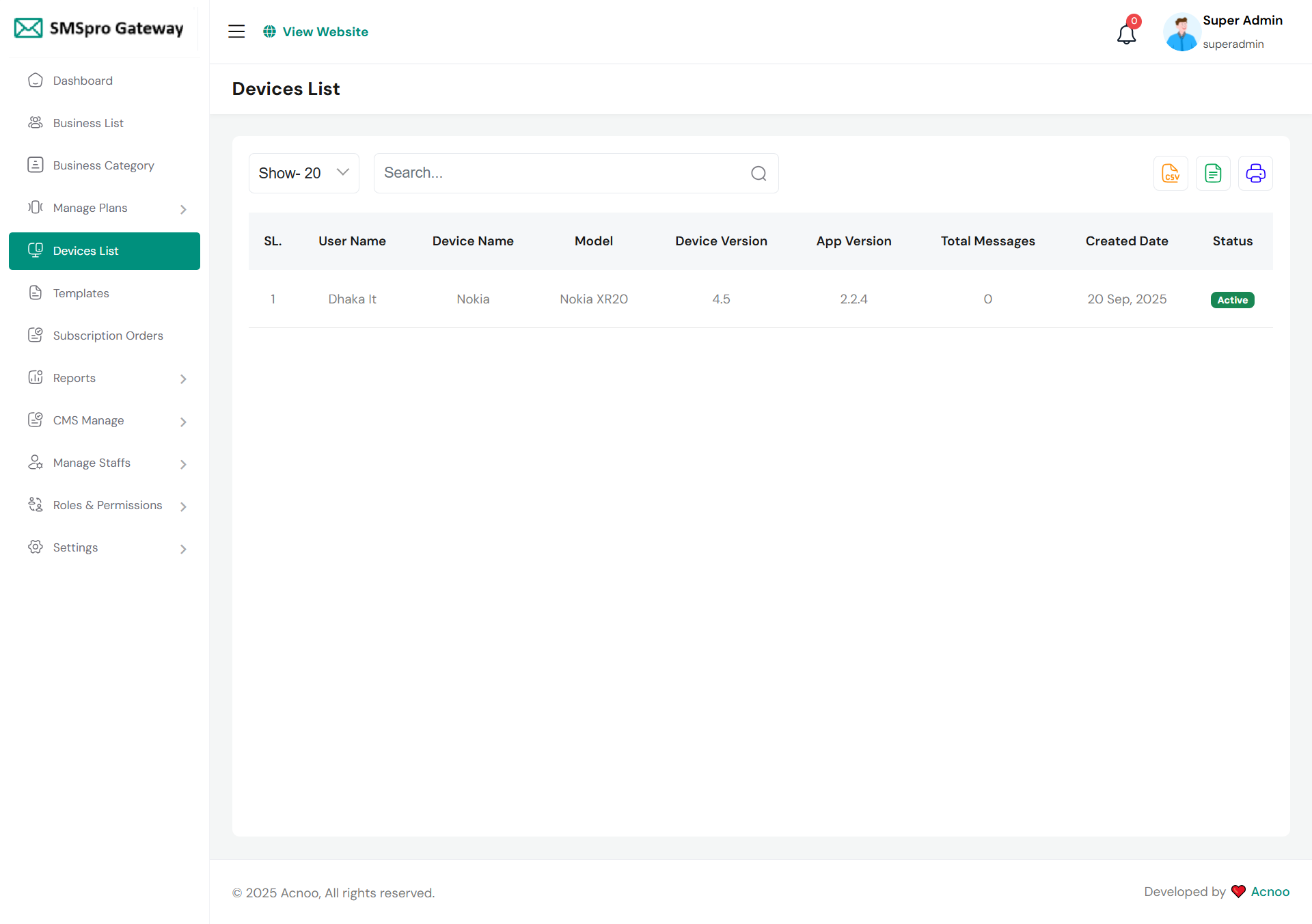 Here, you can view a list of available device. Also you can filter by user name, device name, model etc. From here you can also export excel, csv and print.