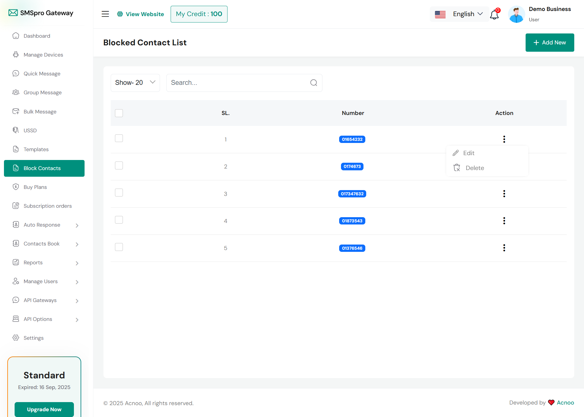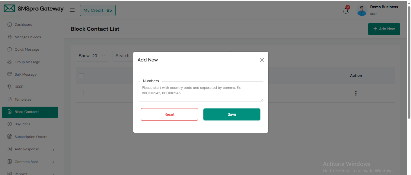 In this section, you can create a blocked contact list by adding numbers. Remember, each number should start with the country code and be separated by commas.
