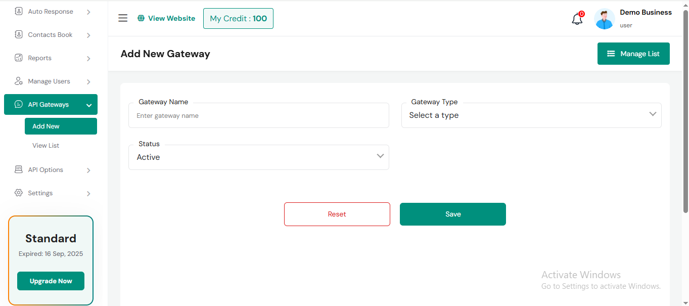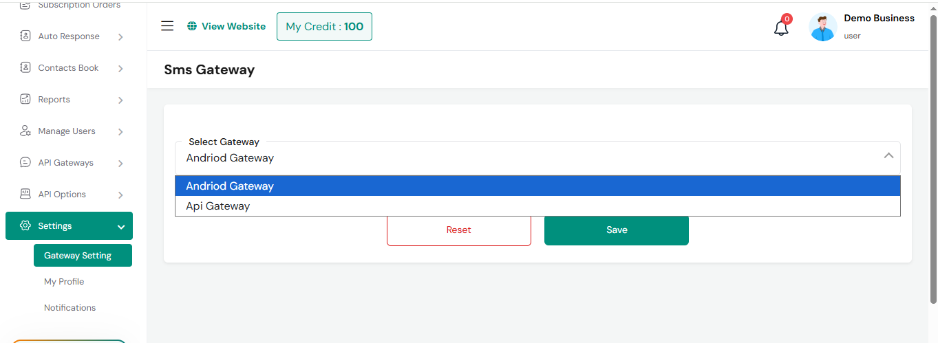 If you select API Gateway, you can only send SMS. On the right side, choose your preferred API Gateway. If no API Gateway has been added yet, go to API Gateway and add one first.