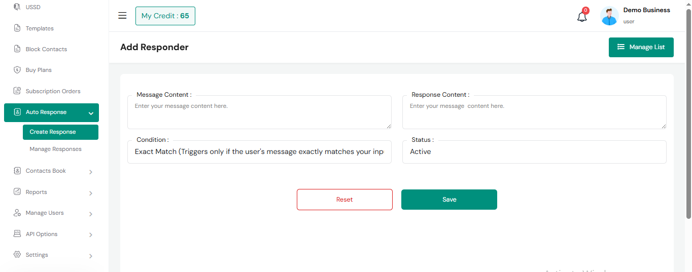 You can set an auto-response for incoming messages. For example, if you set the trigger as "Hi" and the response as "Hello," then whenever someone sends "Hi," they will receive "Hello" automatically. The system will match messages based on these conditions: