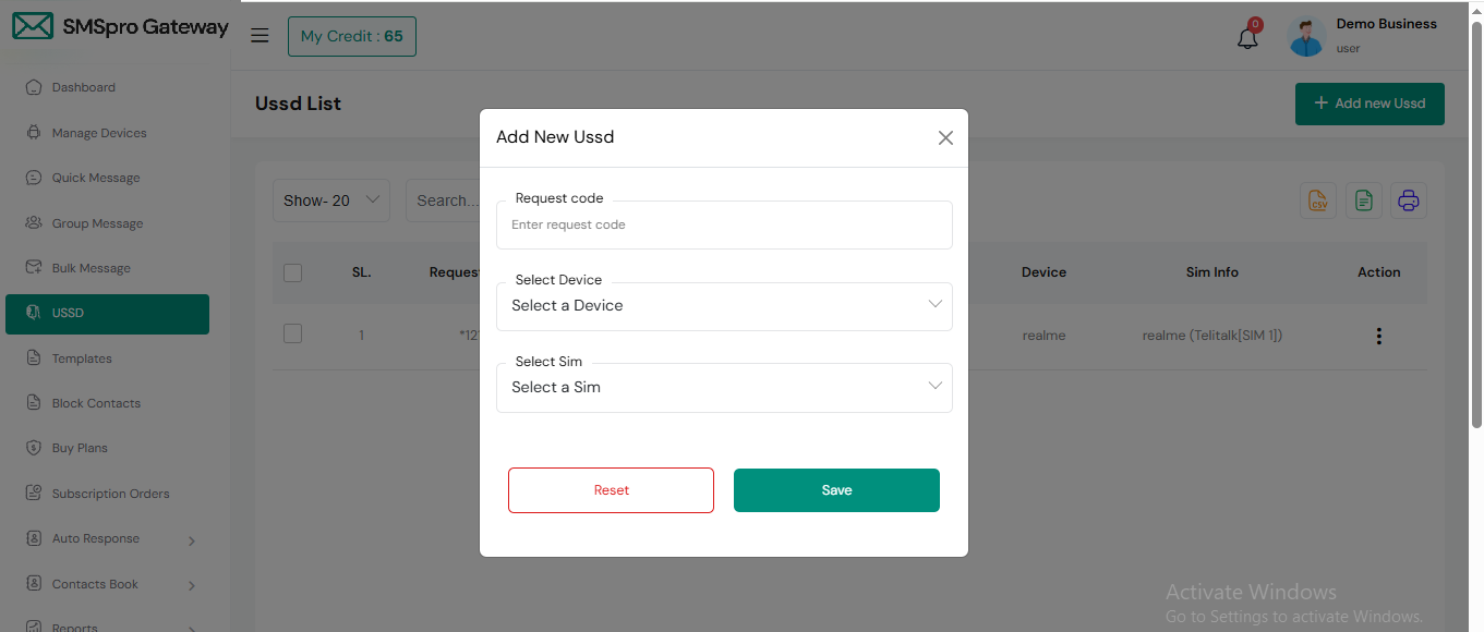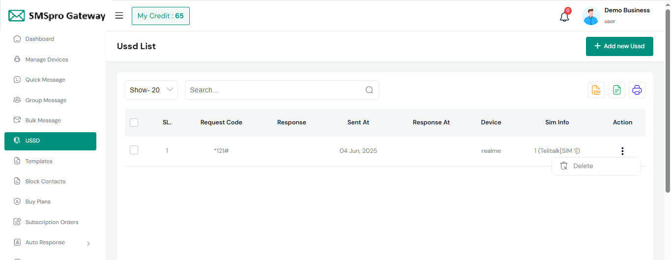 This "Add New USSD" form allows users to send a USSD request through a specific device and SIM. It's typically used for balance checks, data usage, or service activation using USSD codes (e.g., *121#, *111#, etc.).
