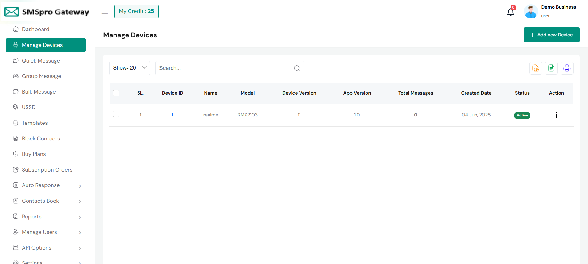 After successfully registering a device, it will appear in the device list as shown in the image below.