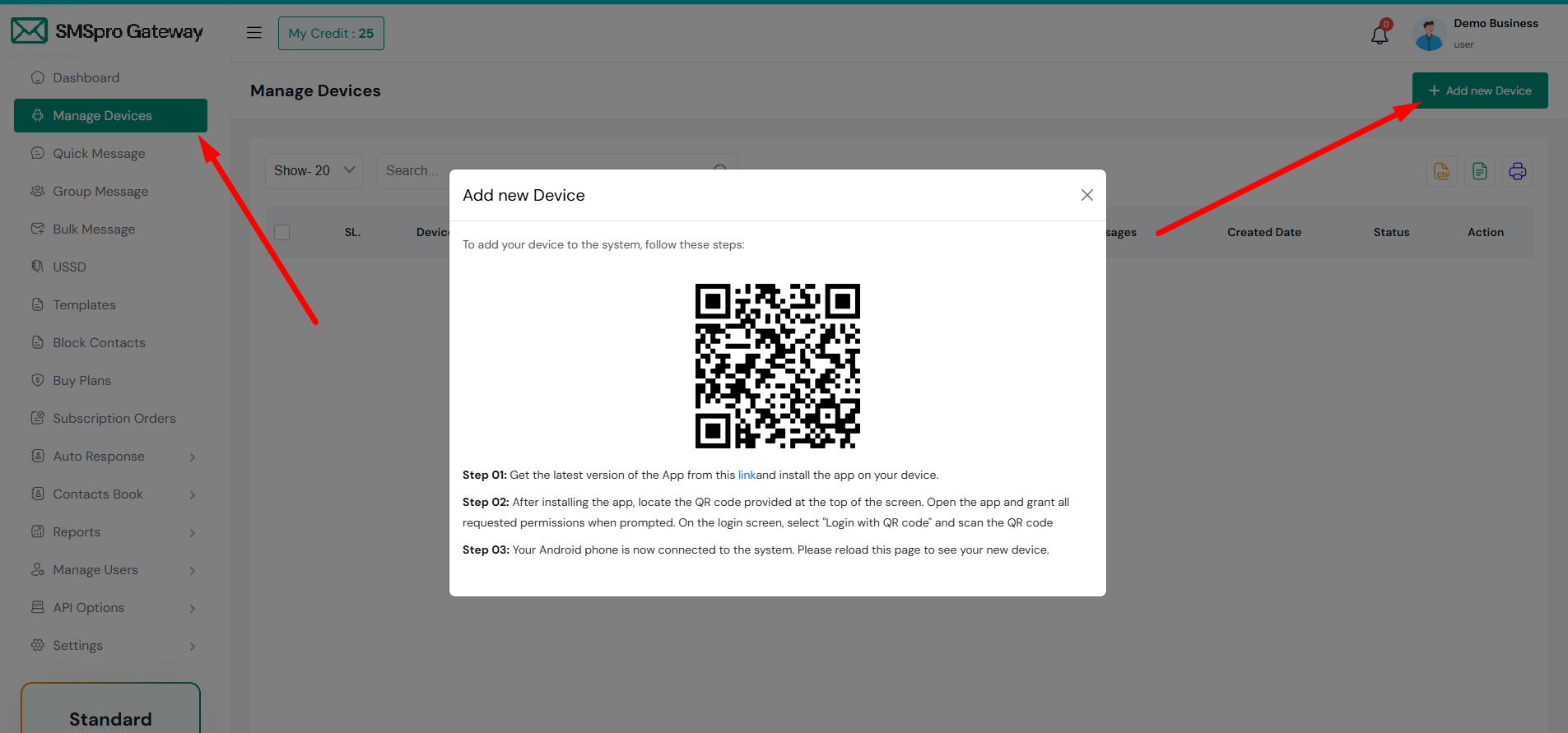 Before you can start sending messages, you must first add your device to the system. To do this, click the + Add New Device button. A popup will appear as shown in the image below. Follow the on-screen instructions in the popup to complete the device registration process.