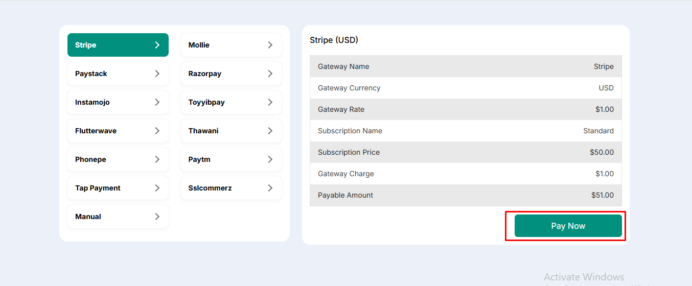 Once you've selected your desired plan, click to view the available payment options. After completing the payment, your plan will be successfully upgraded.