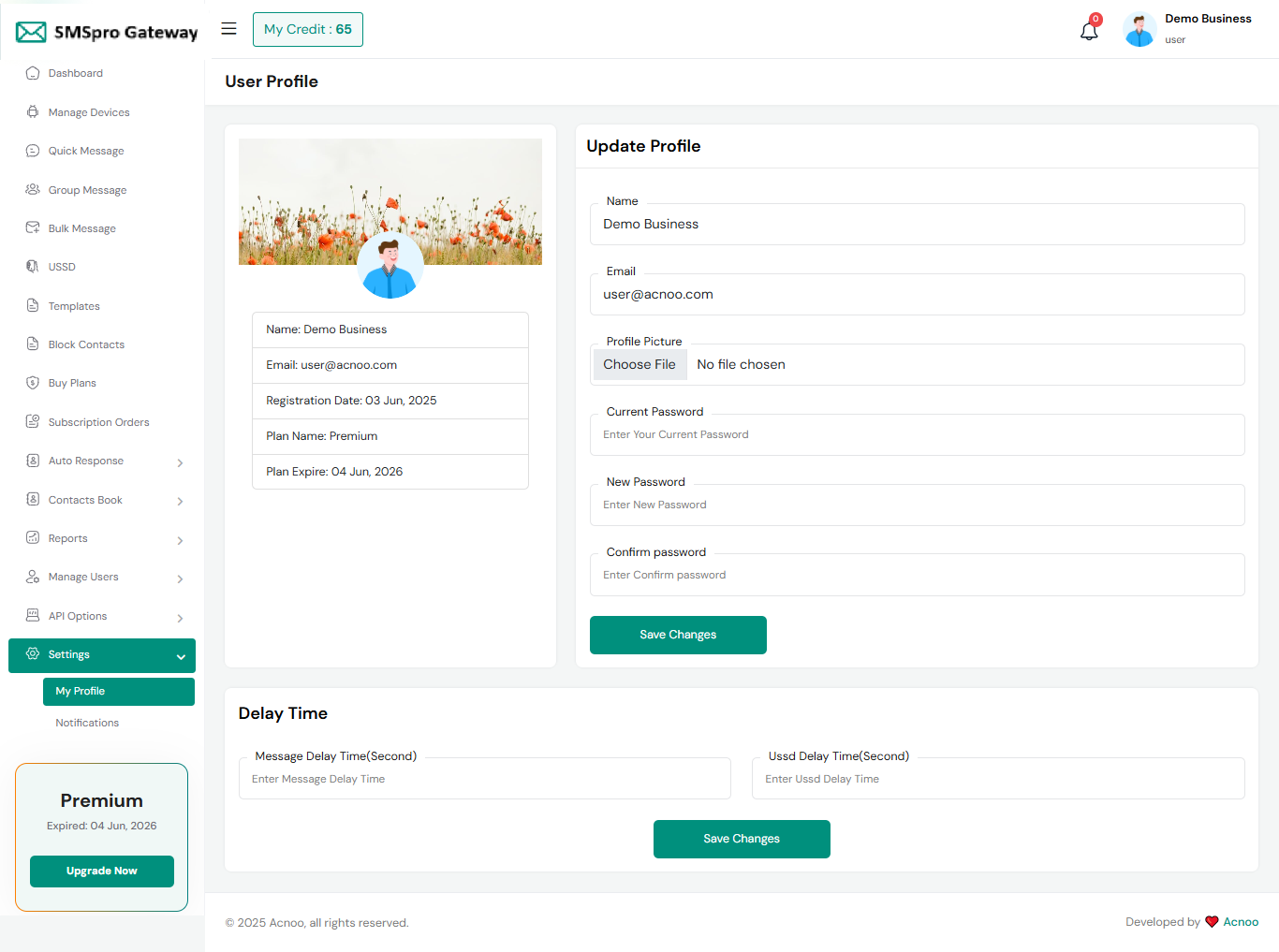 You can update your profile information here. If you change your password, make sure to remember it. You can also view your plan details and update your delay message time and USSD delay time (in seconds).