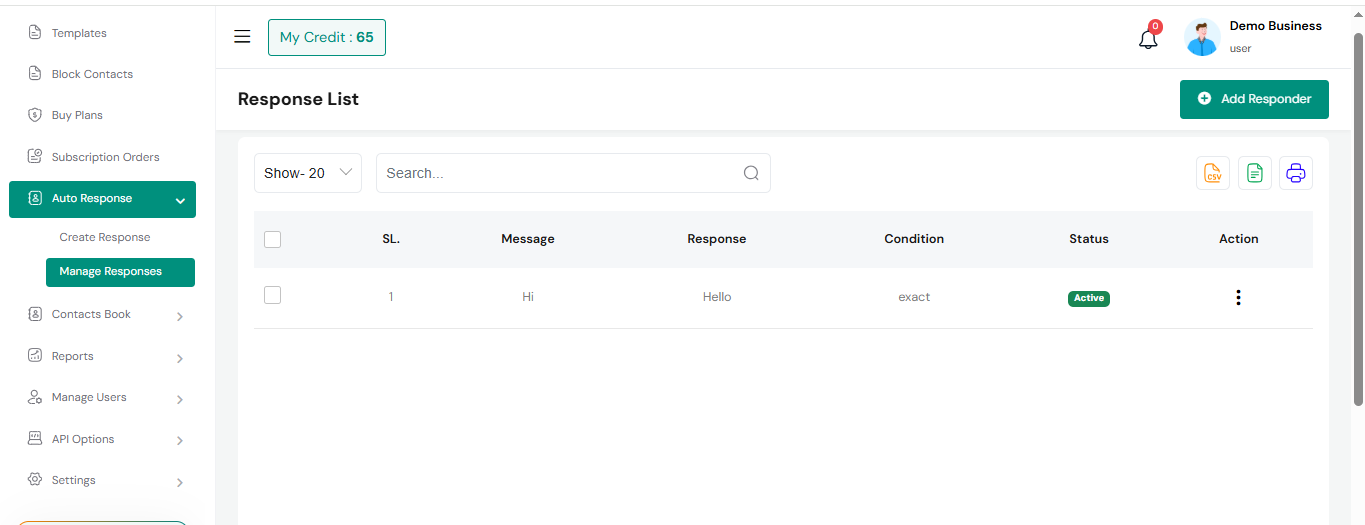 This section displays a list of auto responses based on incoming messages. You can search, filter, and export data as needed.