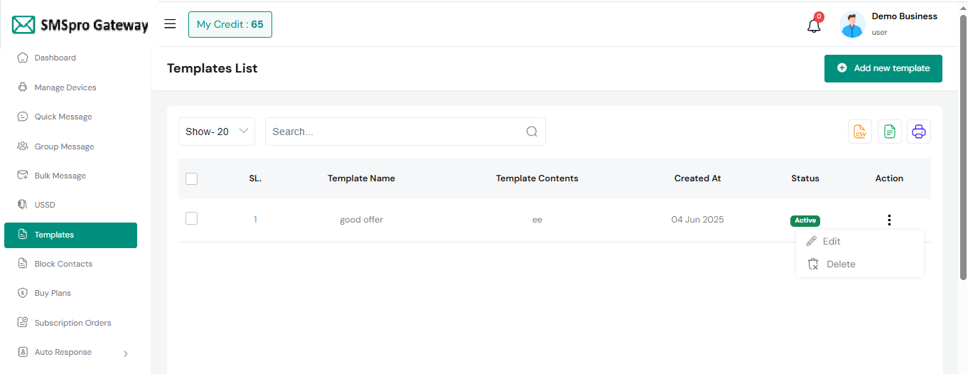In this section, you can view a list of templates along with a search option to find specific templates easily. Additionally, options to edit and delete templates are available for managing your templates efficiently.