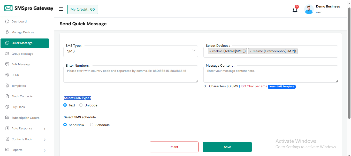 For both gateways, you can choose to send SMS immediately or schedule it for a specific time. You can enter a single number or multiple numbers separated by commas. SMS messages can be sent in either Text or Unicode format. By clicking the "Insert SMS Template" button, you can also use your predefined templates for faster message creation.